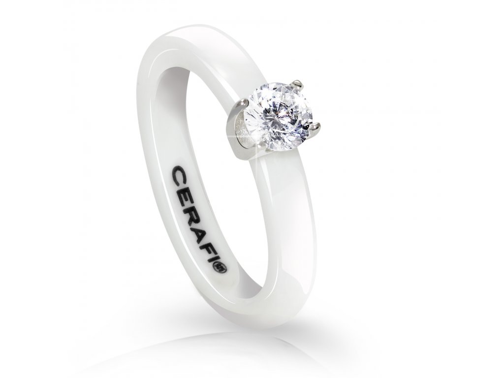 Krásný prsten z bílé hi-tech keramiky v jehož stříbrné korunce je osazen zirkon briliantového výbrusu o velikosti 5mm. Ideálně se tento soliter hodí jako prsten zásnubní. Prsten CERAFI ...protože si zasloužíte tu nejkrásnější ozdobu!